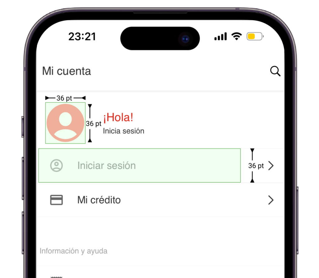 Asigna a todos los controles y elementos interactivos un área de “toque” que mida al menos 36 x 36 pt. Las personas con movilidad reducida necesitan objetivos más grandes que les ayuden a interactuar con tu aplicación. Puede resultar frustrante interactuar con controles demasiado pequeños en cualquier plataforma, incluso cuando se utiliza un puntero.