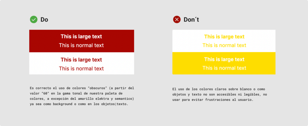 El uso incorrecto en colores puede demeritar nuestro producto, quitar visibilidad al usuario y crear frustraciones provocando usuarios desertores. Procura hacer buen uso de los colores tanto de marca como semánticos.
