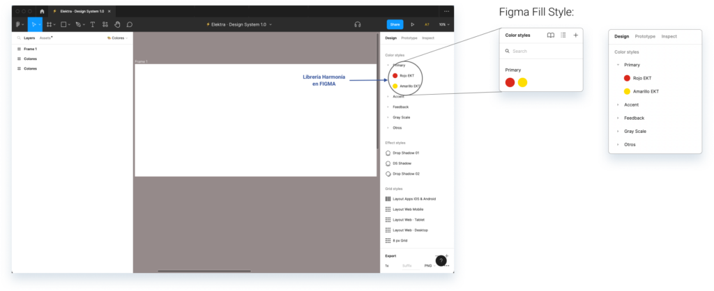 Todos estos estilos los podrás encontrar directamente en la biblioteca de assets del Design System de Elektra en Figma en la sección: Color Styles