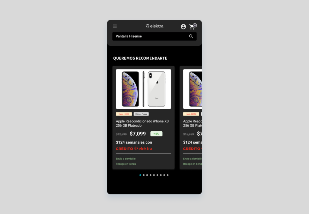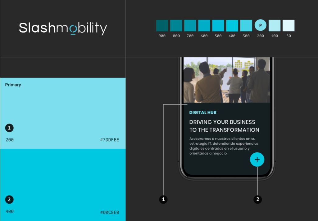 Para conservar la identidad de marca en el modo oscuro se recomienda utilizar el color primario saturado en uno o dos elementos, como por ejemplo un botón o un logotipo. Y usar en el resto de la interfaz el mismo color primario pero en el tono 200.