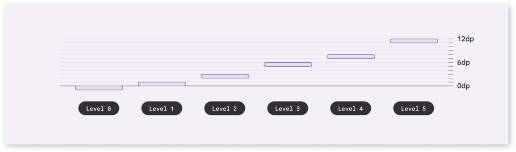 El sistema de elevación se limita deliberadamente a un puñado de niveles. Harmonía utiliza seis niveles de elevación, cada uno con su correspondiente valor dp. Estos valores se denominan por su distancia relativa sobre la superficie de la interfaz de usuario: 0, +1, +2, +3, +4 y +5.