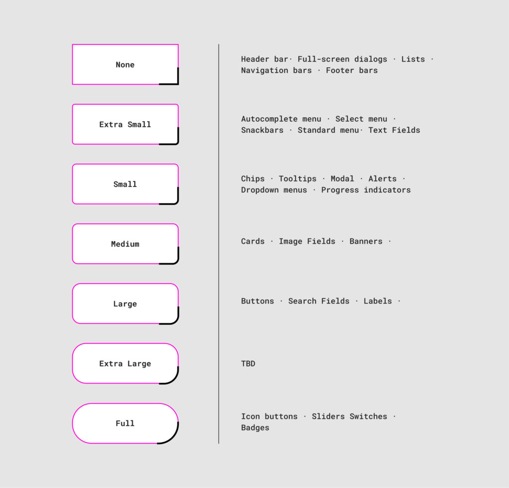 Los siguientes parámetros son los sugeridos para hacer uso de las esquinas redondeadas de manera correcta, de acuerdo al tipo de componente o tamaño no de este.