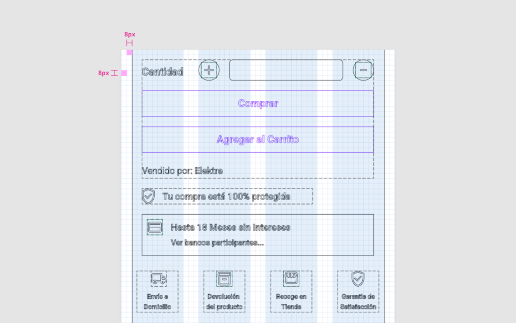 Esta retícula encaja perfectamente con las columnas y el ancho del frame especificadas en la sección Layouts con el objetivo de tener diseños consistentes entre todos los colaboradores que participan en el diseño y desarrollo del e-commerce de Elektra.
