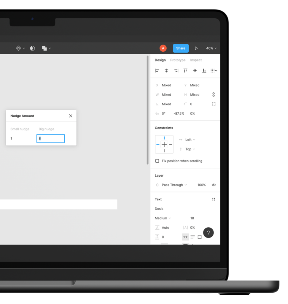 El Nudge Amount es una propiedad muy práctica en Figma que nos permite definir que tantos píxeles se van a mover nuestros elementos al desplazarlos por nuestro espacio de trabajo.