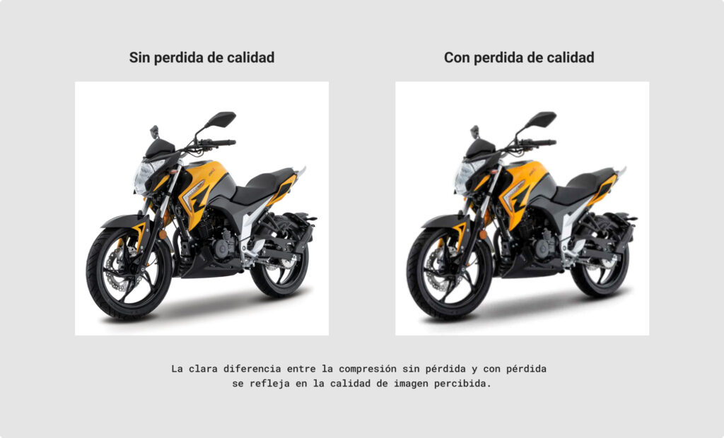 Las imágenes sin pérdida de calidad (como .png y .gif) solo elimina los datos no esenciales, como resultado, la calidad de la imagen no se reduce, pero la compresión no es tan significativa y contaremos con imágenes de mayor peso. Sacrificamos peso por una mayor calidad.