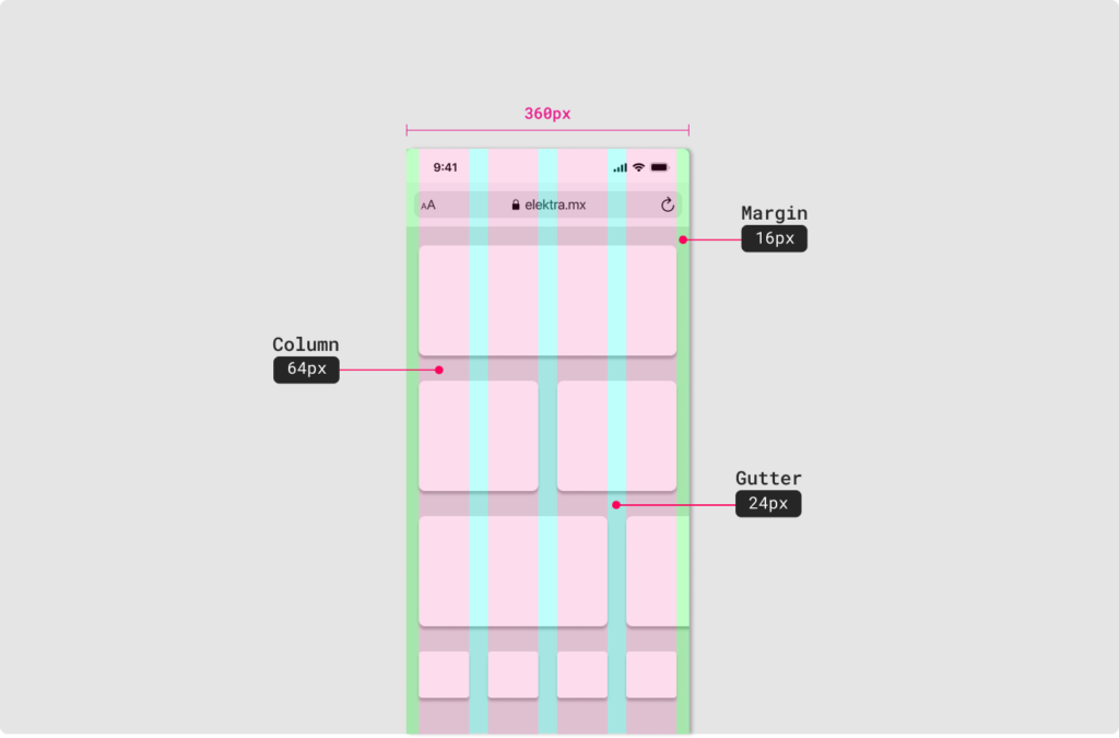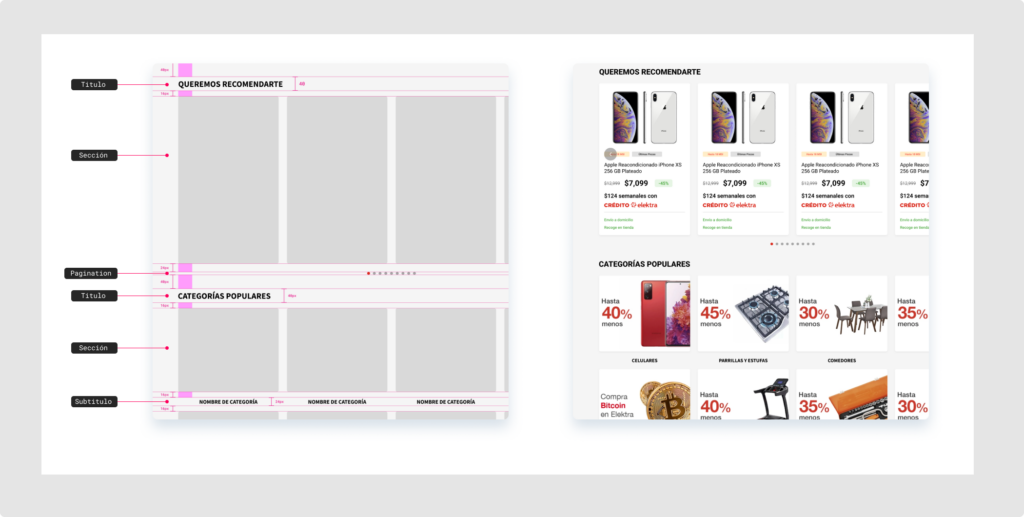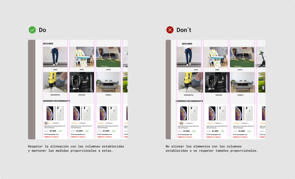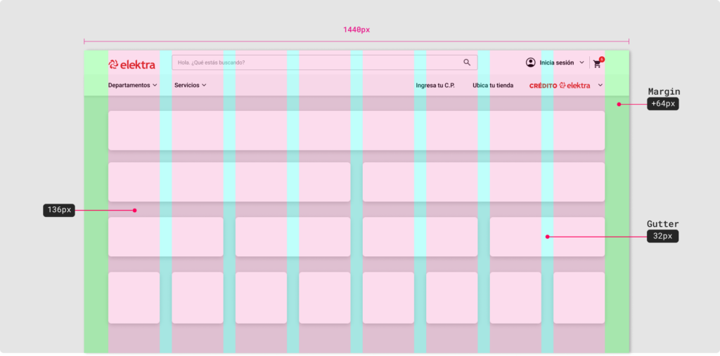 Aplicando correctamente todos los fundamentos anteriores tenemos como resultado los siguientes layouts y las columnas de contenido que las conforman, las cuales nos dan la pauta correcta para diseñar la estructura del contenido en el e-commerce de Elektra así como generar las dimensiones correctas de las secciones, componentes y elementos que conforman el sistema.