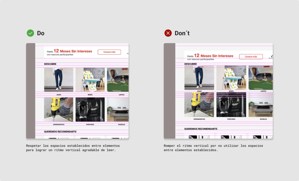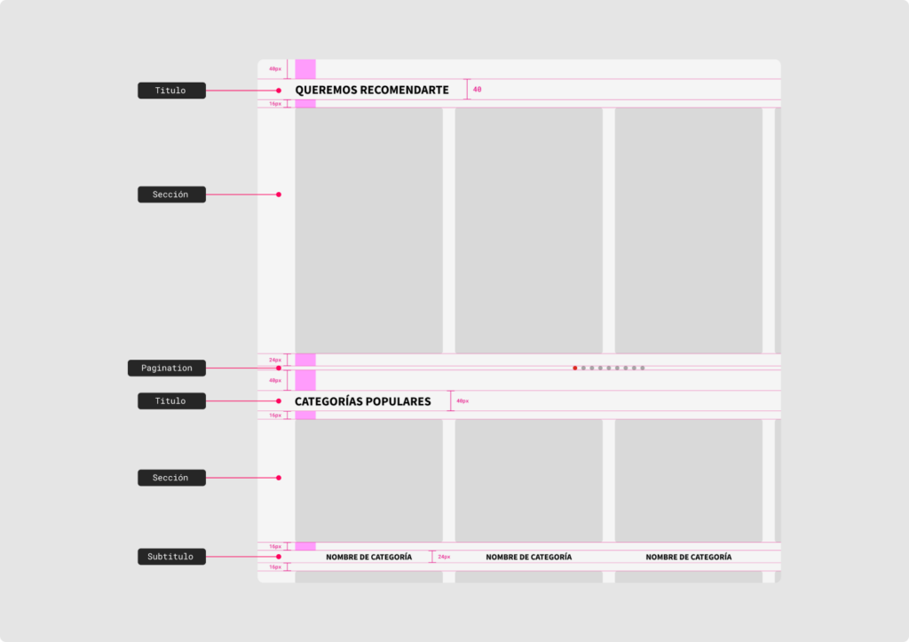 Se sugiere mantener las siguientes separaciones básicas entre los elementos para darle un buen ritmo vertical a las pantallas a lo largo de su desplazamiento y brindar la percepción de calidad y organización a los usuarios.