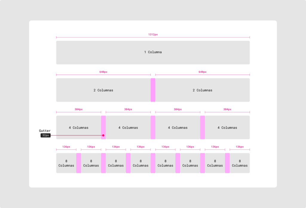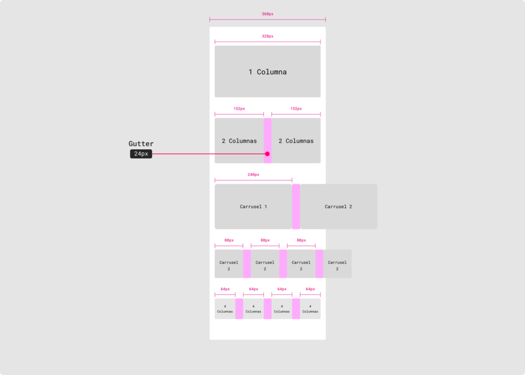 La proporción del contenido deberá mantenerse siempre fijo y tanto las columnas como los medianiles (Gutters) requieren persistir siempre con las medidas indicadas.