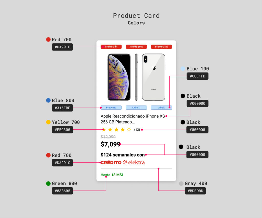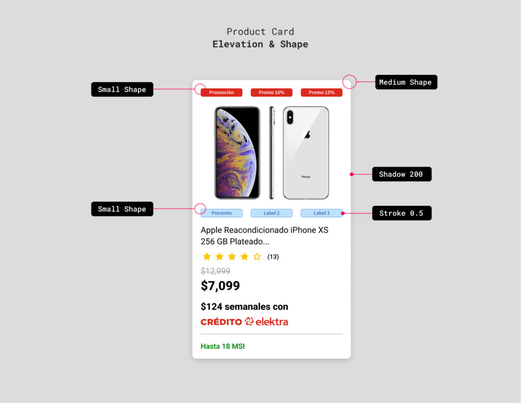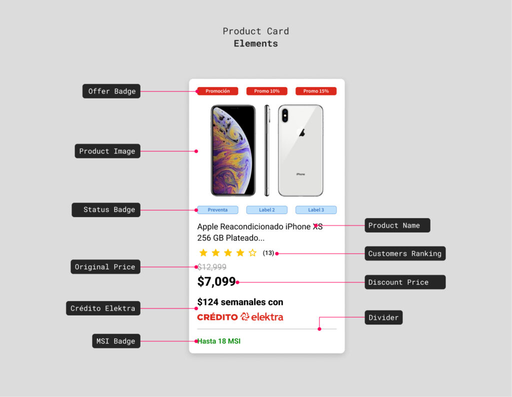 Los elementos de la Product Card deben de transmitir a nuestros usuarios información útil y rápida de un solo vistazo a manera de un resumen del producto y sus principales características.