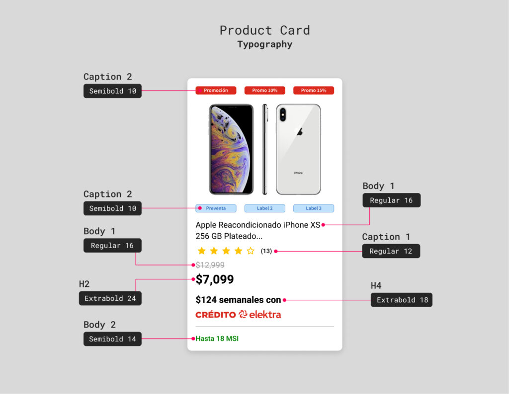 Los tamaños de la tipografía definida en esta product card, han sido dadas para generar un equilibrio ideal entre los títulos y la información relevante del producto a mostrar, es esencial que se respeten para lograr este objetivo.