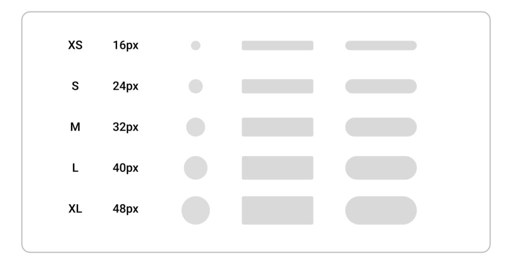 Los elementos del skeleton loader vienen en cinco tamaños para coincidir con los tamaños típicos de los componentes dentro del sistema: extra pequeño, pequeño, mediano, grande y extra grande.